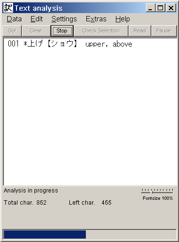 After inputting data, click the button, or select Data > Start Analysis from the menus, or you may press Ctrl+Y on your keyboard. KanjiQuick will display in the Results List all entries found in the text within the Text input box . At the bottom, the number of total characters in the input box and the number of characters still to be processed is displayed.