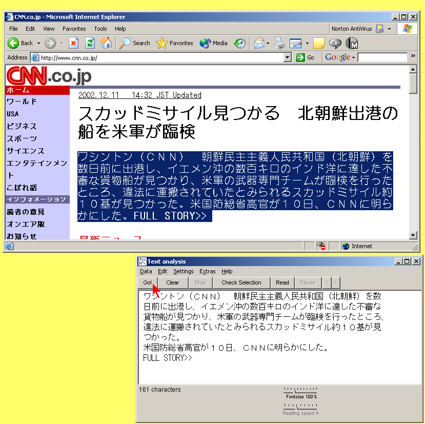 Copy text from another application and paste it in the Text input box of the Transer Text Analysis module. Copying can also be performed by pressing the Ctrl+C or Shift+Delete keys; pasting by the Ctrl+V or Shift+Insert keys. With some applications like MS Word® and MS Internet Explorer® (see example below), drag and drop is also available.