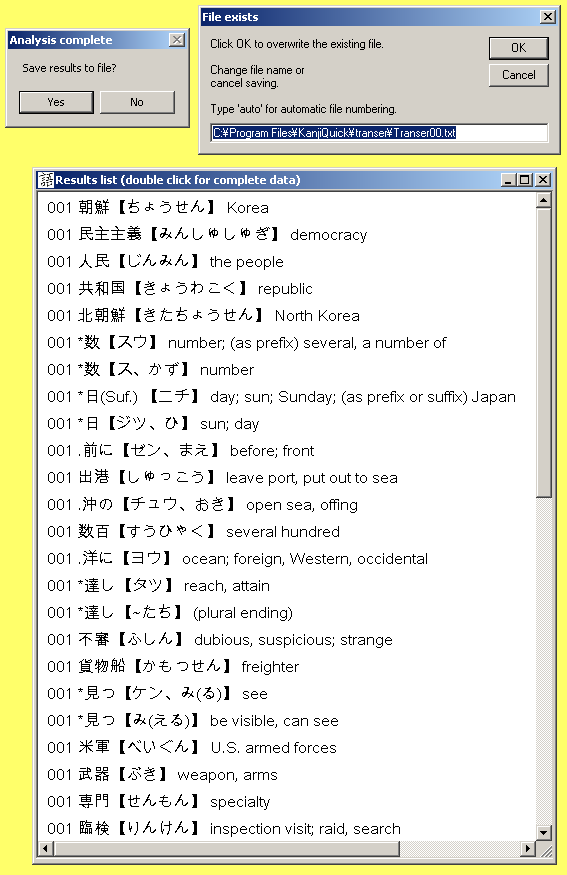 The Results List window data can be saved to a file. The initial default filename is Transer00.txt. This file will be saved to your ...\KanjiQuick\transer folder. To save the file, choose in the Analysis Complete message window that appears, or to cancel saving. If you check AutoSave Results from the Settings menu of the Text Analysis window, all results will be saved automatically. If a file with the save name already exists, KanjiQuick will prompt you to change the name or confirm to replace the existing file with the new one. Type "auto" (without the quotes) instead of a file name to automatically number all saved files. You may also press Ctrl+R to auto-number the saved files. The file names created by default will be Transernn, with nn corresponding to the next available number in serial order, up to 100 files (nn = 00 through 99). The file is Unicode-encoded, and can be read by Microsoft Word®. Columns are separated by tabs in order to easily format the text as a table. The auto-numbering, file-save option is valid as long as the Text Analysis window has not been closed.