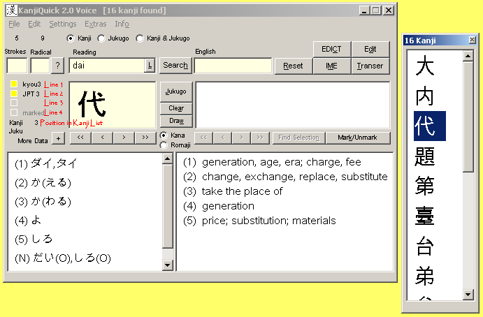 Top line: Kyouiku kanji: This line will tell you if the kanji belongs to one of the 6 grades of the 1,006 kyouikukanji ("kyou1" to "kyou6"). The box color will turn yellow. Jouyoukanji: If the kanji belongs to the jouyou group (but not to the kyouiku group) this line will read "jouyou" and the box color will turn green. There are 1,945 jouyoukanji, and they include all the kyouikukanji as a subset.