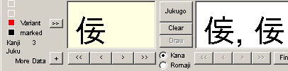 Third line: Variant (old or non-standard) shapes of a standard kanji (box color will turn red). If enabled, (only with variant characters as in the lower example) you may click the button to the right of "Variant" to display the standard shape and more variants, if any. Variants marked red are kanji rarely found in modern texts.