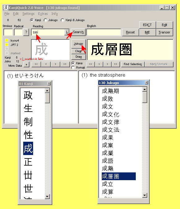 If a KanjiQuick search returns more than one kanji or jukugo matching your search criteria, separate Kanji and Jukugo windows will open for each list as needed. You may use the left- and right-arrow buttons below the Kanji and Jukugo display boxes to navigate through each window list.