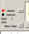 The total number of entries in the list is displayed in the title bar of each window. The number of the entry selected can be found to the lower-left of the Kanji display box , beside "Kanji" and "Juku," respectively. In the example below, the third entry in the Kanji list is selected. Also, the kanji selected is a variant which is rarely found in modern texts. Click the button to the right of the word "Variant" to display all variants of this character. The square to the left of "marked" is black when the kanji displayed has been previously marked by you.