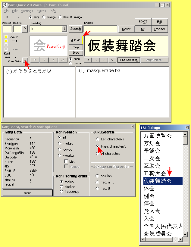 There are three ways KanjiQuick will list the entries in the Jukugo window.