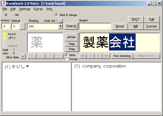 Select any kanji string from a jukugo compound in the Jukugo display box , and KanjiQuick will display the search results after you release the mouse button. From other windows, highlight the characters and then click the button in the main KanjiQuick program window. KanjiQuick will search for a single kanji or jukugo matching your selection. If nothing is selected when you click , KanjiQuick will search for the first character in the Jukugo display box only.
