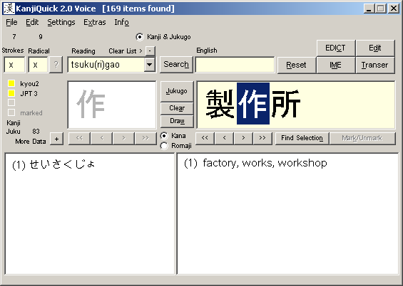 You may search for information on any kanji contained in a compound. Just highlight one or more kanji from the Jukugo display box and KanjiQuick will automatically find your selection. Highlight kanji within other KanjiQuick windows and click the button. With no kanji selected, if you click the button, KanjiQuick will search for the first kanji in the compound displayed in the Jukugo display box .