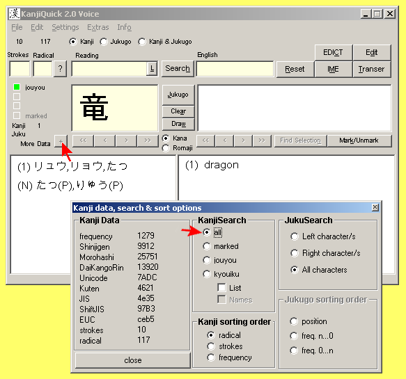 KanjiQuick will search for all kanji in the database matching the search criteria (default setting).